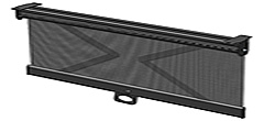 Manual roll-type screen sun visor shade with stabilizing scissor arms for vertical or angled applications. Roller is fitted inside a compact aluminum mounting rail for easy side-mount installation.
