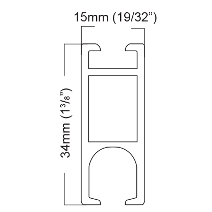 - Clear anodized aluminum rail in 6063-T5 alloy, dimmension 15mm (5/8") wide x 34mm (1 3/8") high.