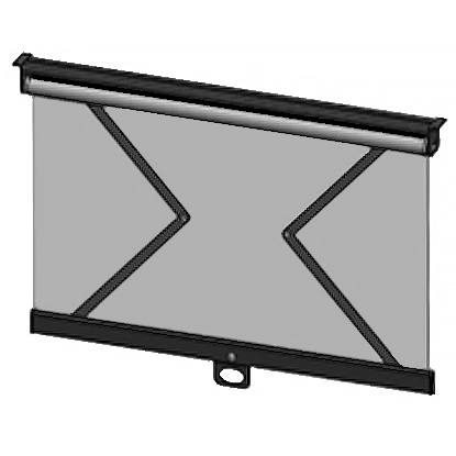 Manual roll-type screen sun visor shade with stabilizing cantilever arms for vertical or angled applications. Roller is fitted inside a compact aluminum mounting rail for easy side-mount installation.